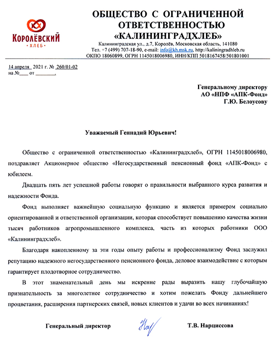 15.04.2021 Поздравление от ООО «Калининградхлеб» в связи с 25-летием АО «НПФ «АПК-Фонд»