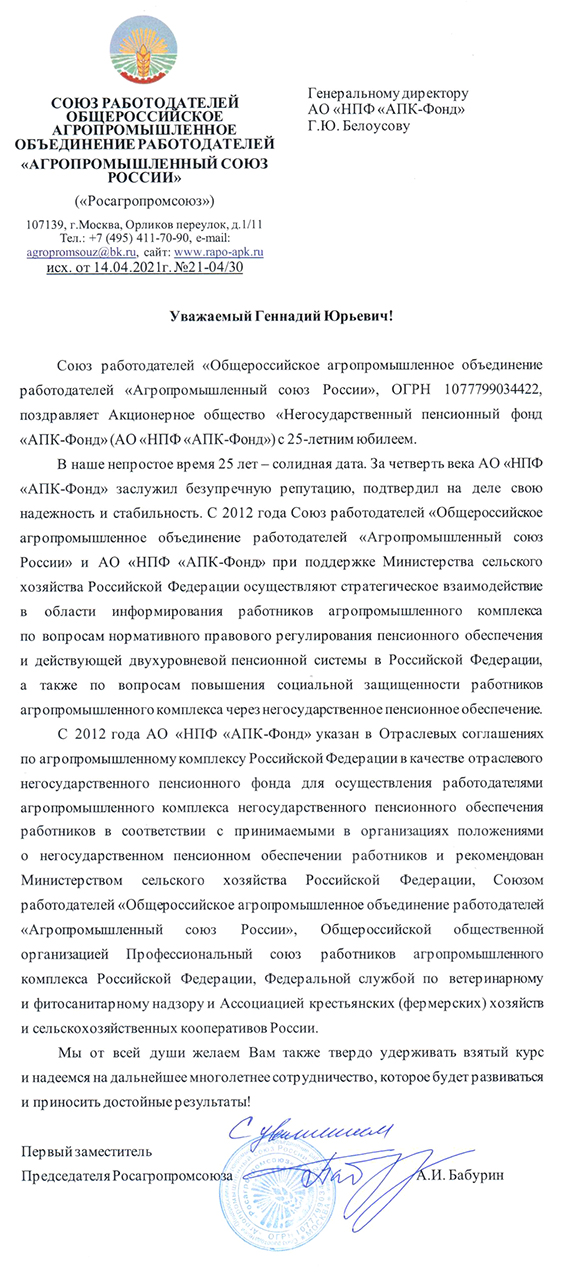 15.04.2021 Поздравление от Росагропромсоюза в связи с 25-летием АО «НПФ «АПК-Фонд»