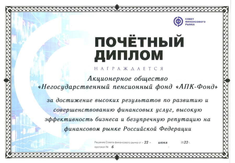 08.12.2022 Акционерное общество "Негосударственный пенсионный фонд "АПК-Фонд" награжден почетным дипломом Совета финансового рынка за достижение высоких результатов по развитию и совершенствованию финансовых услуг, высокую эффективность бизнеса и безупречную репутацию на финансовом рынке Российской Федерации.